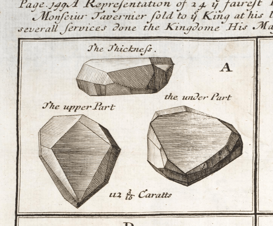 Tavernier’s diagram of the diamond that would later be cut down into the French Blue [image credit: from Tavernier’s Six Voyages of John Baptista Tavernier; Smithsonian]
