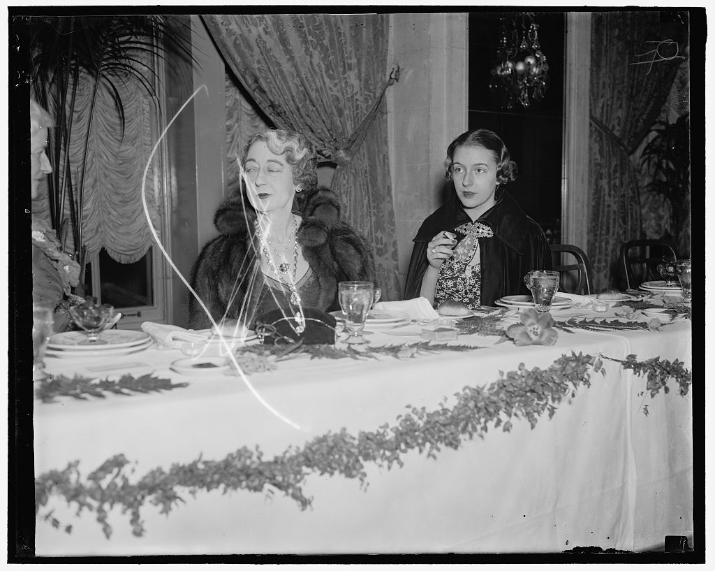 Evalyn Walsh McLean wearing the Hope Diamond at a dinner party, c. 1936 [image source: Library of Congress]