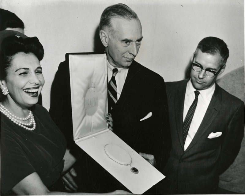 The Hope Diamond presented to the Smithsonian National Museum of Natural History, with Edna Winston (left) [image source: Smithsonian]