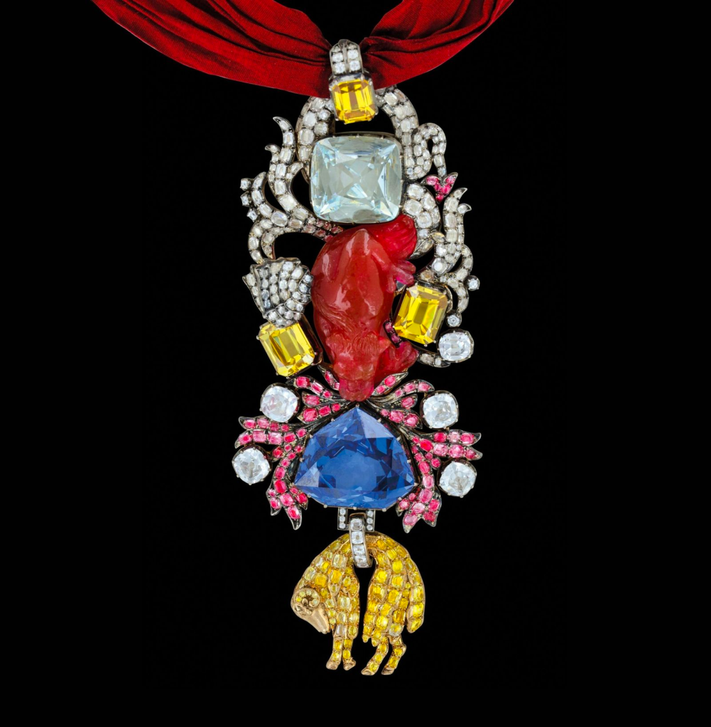 A replica of Louis XV’s Insignia of the Golden Fleece, featuring the French Blue and the Cote de Bretagne (the red spinel dragon) [image source: National Geographic]