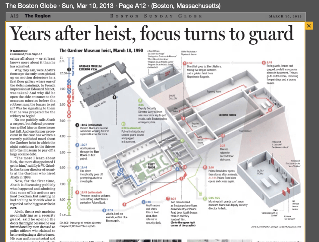 - Dabilis, Andy and John Ellement. “$200m Gardner Museum Art Theft.” The Boston Globe (Boston, MA), March 19, 1990.